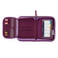 Jednopatrový školní penál se 2 chlopněmi, prázdný obsahuje 25 gumových poutek pro uchycení psacích potřeb. Na vnitřních chlopních jsou průhledné fólie pro rozvrh hodin.