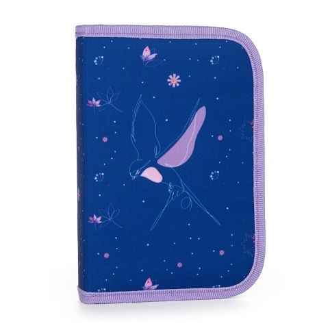 Jednopatrový školní penál s 2 chlopněmi, prázdný obsahuje 25 gumových poutek pro uchycení psacích potřeb. Na vnitřních chlopních jsou průhledné fólie pro rozvrh hodin.