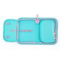 Jednopatrový školní penál s 2 chlopněmi, prázdný obsahuje 25 gumových poutek pro uchycení psacích potřeb. Na vnitřních chlopních jsou průhledné fólie pro rozvrh hodin.