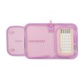 Jednopatrový školní penál s 2 chlopněmi, prázdný obsahuje 25 gumových poutek pro uchycení psacích potřeb. Na vnitřních chlopních jsou průhledné fólie pro rozvrh hodin.
