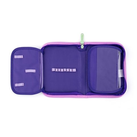 Jednopatrový školní penál s 2 chlopněmi, prázdný obsahuje 25 gumových poutek pro uchycení psacích potřeb. Na vnitřních chlopních jsou průhledné fólie pro rozvrh hodin.