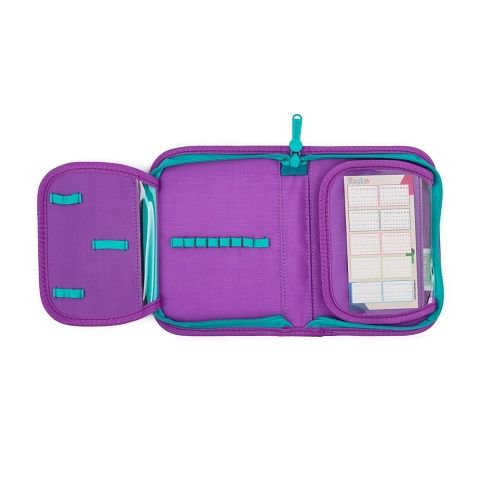 Jednopatrový školní penál s 2 chlopněmi, prázdný obsahuje 25 gumových poutek pro uchycení psacích potřeb. Na vnitřních chlopních jsou průhledné fólie pro rozvrh hodin.