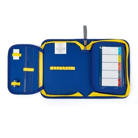Jednopatrový školní penál se 2 chlopněmi, prázdný obsahuje 25 gumových poutek pro uchycení psacích potřeb. Na vnitřních chlopních jsou průhledné fólie pro rozvrh hodin.