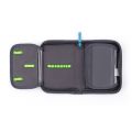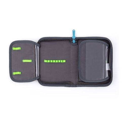 Jednopatrový školní penál s 2 chlopněmi, prázdný obsahuje 25 gumových poutek pro uchycení psacích potřeb. Na vnitřních chlopních jsou průhledné fólie pro rozvrh hodin.