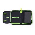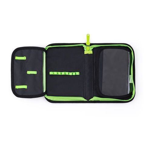 Jednopatrový školní penál s 2 chlopněmi, prázdný obsahuje 25 gumových poutek pro uchycení psacích potřeb. Na vnitřních chlopních jsou průhledné fólie pro rozvrh hodin.