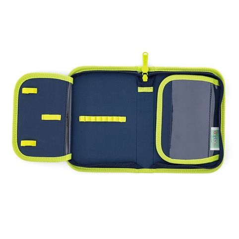 Jednopatrový školní penál se 2 chlopněmi, prázdný obsahuje 25 gumových poutek pro uchycení psacích potřeb. Na vnitřních chlopních jsou průhledné fólie pro rozvrh hodin.