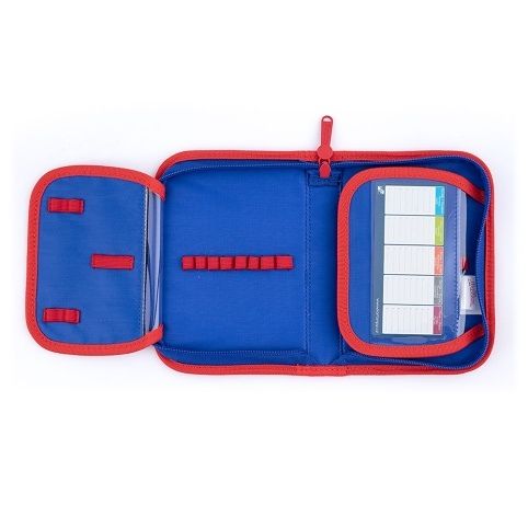 Jednopatrový školní penál se 2 chlopněmi, prázdný obsahuje 25 gumových poutek pro uchycení psacích potřeb. Na vnitřních chlopních jsou průhledné fólie pro rozvrh hodin.