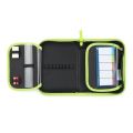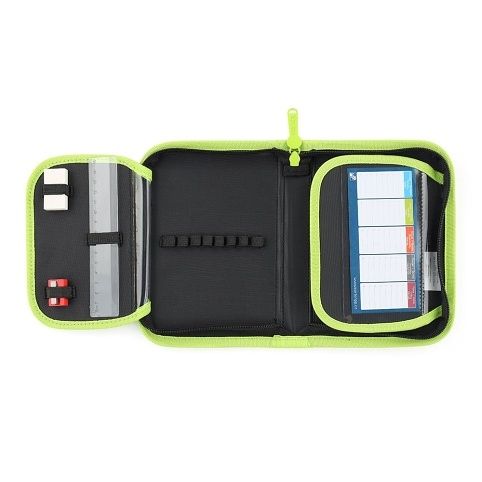 Jednopatrový školní penál se 2 chlopněmi, prázdný obsahuje 25 gumových poutek pro uchycení psacích potřeb. Na vnitřních chlopních jsou průhledné fólie pro rozvrh hodin.