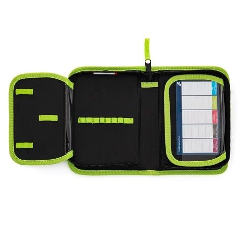 Jednopatrový školní penál se 2 chlopněmi, prázdný obsahuje 25 gumových poutek pro uchycení psacích potřeb. Na vnitřních chlopních jsou průhledné fólie pro rozvrh hodin.