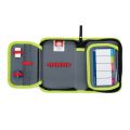 Jednopatrový školní penál s 2 chlopněmi, prázdný obsahuje 25 gumových poutek pro uchycení psacích potřeb. Na vnitřních chlopních jsou průhledné fólie pro rozvrh hodin.