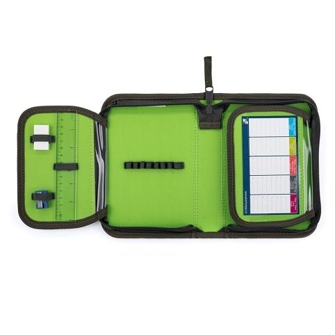 Jednopatrový školní penál se 2 chlopněmi, prázdný obsahuje 25 gumových poutek pro uchycení psacích potřeb. Na vnitřních chlopních jsou průhledné fólie pro rozvrh hodin.
