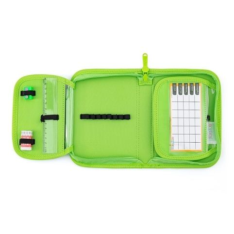 Jednopatrový školní penál s 2 chlopněmi, prázdný obsahuje 25 gumových poutek pro uchycení psacích potřeb. Na vnitřních chlopních jsou průhledné fólie pro rozvrh hodin.