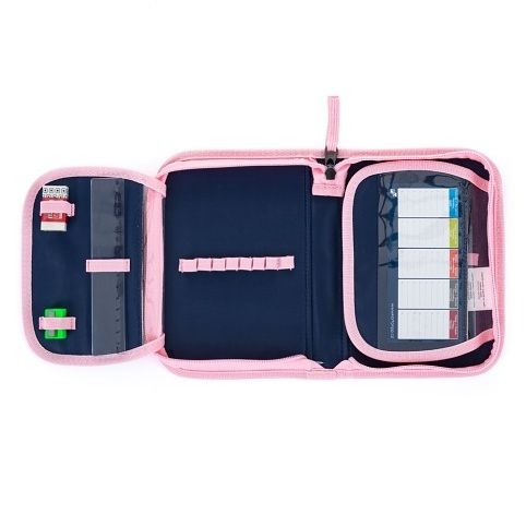 Jednopatrový školní penál se 2 chlopněmi, prázdný obsahuje 25 gumových poutek pro uchycení psacích potřeb. Na vnitřních chlopních jsou průhledné fólie pro rozvrh hodin.