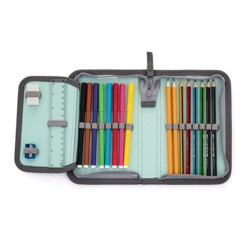 Školní pouzdro s náplní s motivem mopse. Plněný penál obsahuje kvalitní školní potřeby značek Centropen a Staedtler: trojhranné pastelky 6 ks, fixy 8 ks, tužky 2 ks, guma, ořezávátko,pravítko 12 cm, rozvrh hodin.