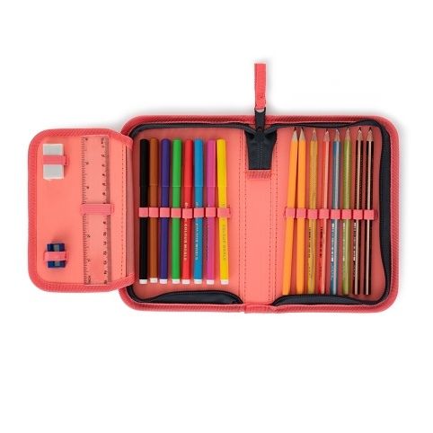 Školní pouzdro s náplní s motivem plameňáka. Plněný penál obsahuje kvalitní školní potřeby značek Centropen a Staedtler: trojhranné pastelky 6 ks, fixy 8 ks, tužky 2 ks, guma, ořezávátko,pravítko 12 cm, rozvrh hodin.