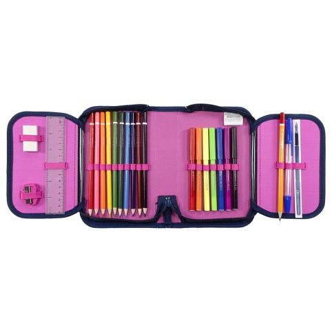 Penál 1 zip, 2 klopy obsahuje: 10 x pastelky, 7 x fixy, propisku, ořezávátko, pryž a pravítko 15 cm.