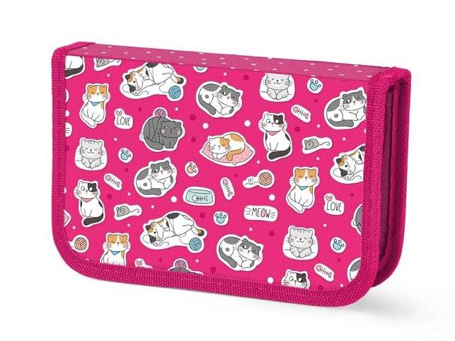 Školní jednopatrový nevybavený penál se dvěma chlopněmi v sytě růžové barvě s motivem koček. Chlopně mají na vnější straně praktickou průhlednou kapsičku na rozvrh. Penál obsahuje 23 poutek na pastelky, tužky a pera a 3 větší poutka např. na nůžky, gumu, ořezávátko nebo pravítko. Velice lehce se uzavírá díky velkému zipu. Bezesporu je nezbytnou součástí vybavení každého školáka. - není vybavený - zdravotně nezávadný a neobsahuje toxické látky DOPORUČENÍ: - čistit pouze navlhčeným hadříkem ve vodě s trochou saponátu Uvedená cena je za 1 ks.