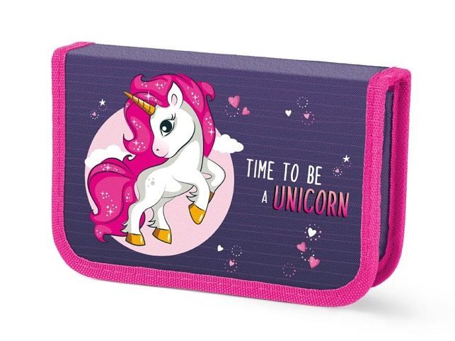Jednopatrový školní penál s motivem jednorožce a nápisem Time to be a Unicorn. Vevnitř penálu jsou přihrádky a poutka na psací potřeby. Penál se uzavírá zipem a je z kvalitních a odolných materiálů. Toto školní pouzdro není vybavené. Penál je zdravotně nezávadný a neobsahuje toxické látky.