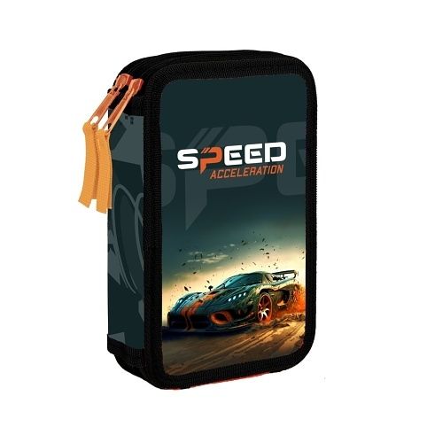 Školní penál dvoupatrový bez náplně. Penál obsahuje 25 gumových poutek pro uložení všech psacích potřeba a drobností potřebných k výuce. Penál má pevný zip s velkými taháčky pro snadnou manipulaci. Jedno patro je opatřeno průhlednou přihrádkou pro týdenní rozvrh.