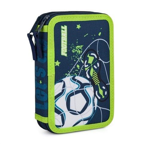 Školní penál dvoupatrový bez náplně. Penál obsahuje 25 gumových poutek pro uložení všech psacích potřeba a drobností potřebných k výuce. Penál má pevný zip s velkými taháčky pro snadnou manipulaci. Jedno patro je opatřeno průhlednou přihrádkou pro týdenní rozvrh.