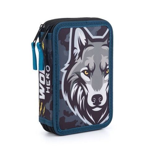 Školní penál dvoupatrový bez náplně s motivem vlka. Penál obsahuje 25 gumových poutek pro uložení všech psacích potřeba a drobností potřebných k výuce. Penál má pevný zip s velkými taháčky pro snadnou manipulaci. Jedno patro je opatřeno průhlednou přihrádkou pro týdenní rozvrh.