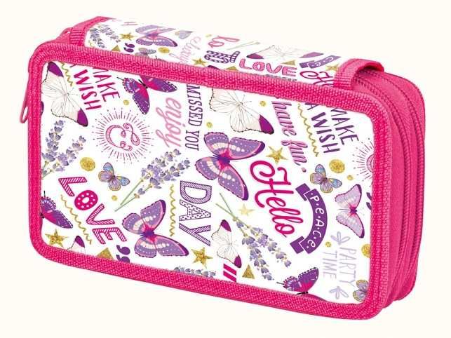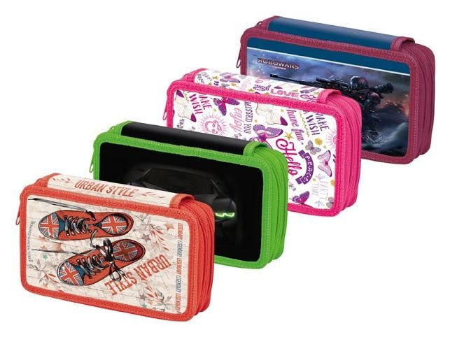 Dvoupatrový školní penál - nezbytná součást výbavy každé školačky! Penál je nevybavený. Velice lehce se uzavírá díky velkému zipu. Penál obsahuje: - v prvním patře 8 malých poutek na pastelky a tužky a 3 velké poutka na pravítko, nůžky, gumu - ve druhém patře 16 malých poutek Penál je zdravotně nezávadný a neobsahuje toxické látky. Uvedená cena je za 1 ks. Dodáváme v mixu dle skladové zásoby ve 4 variantách: - oranžový s botami - růžový s motýly - vínový s robotem - zelený se závodním autem