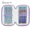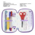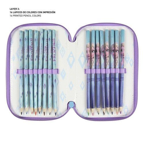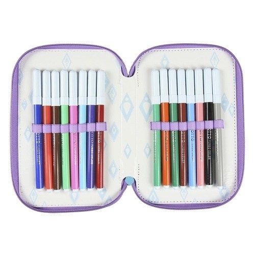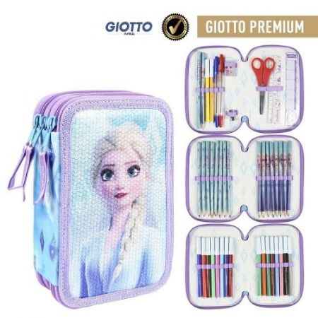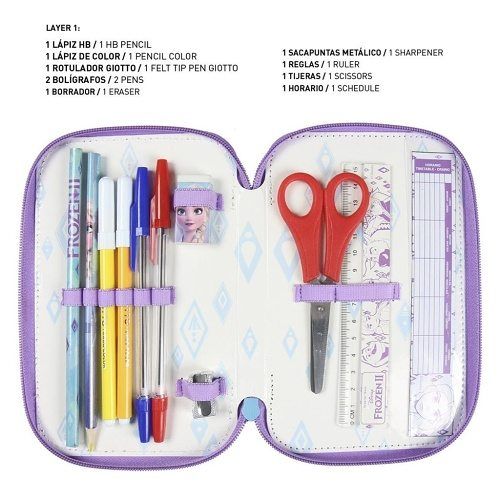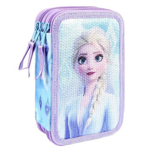Penál 3 patrový Premium Ledové království s flitry. Penál obsahuje 16 pastelek, 20 fixů, pravítko, gumu, nůžky, ořezávátko, 2 obyčejné tužky a 2 propisovačky. Rozměr penálu je 12,5×19,5×6 cm. Materiál 100% polyester.