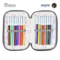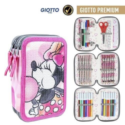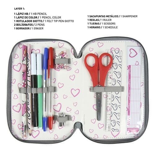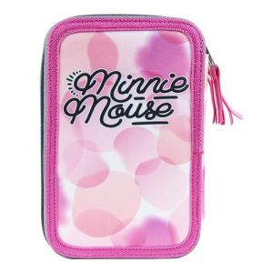 Penál 3 patrový Premium Disney Minnie s flitry. Penál obsahuje 16 pastelek, 20 fixů, pravítko, gumu, nůžky, ořezávátko, 2 obyčejné tužky a 2 propisovačky. Rozměr penálu je 12,5×19,5×6 cm. Materiál 100% polyester.