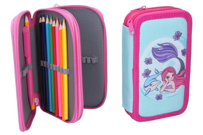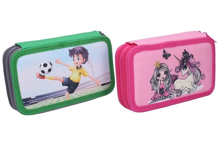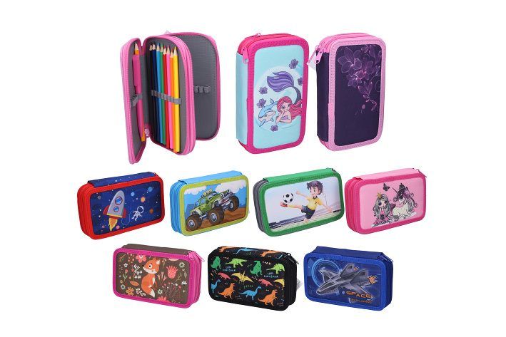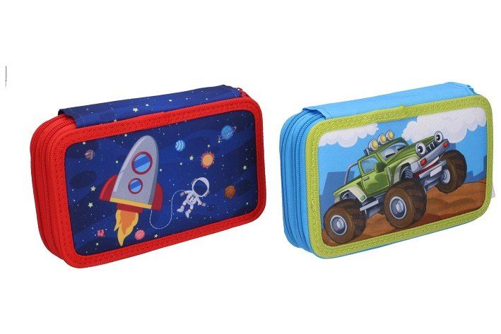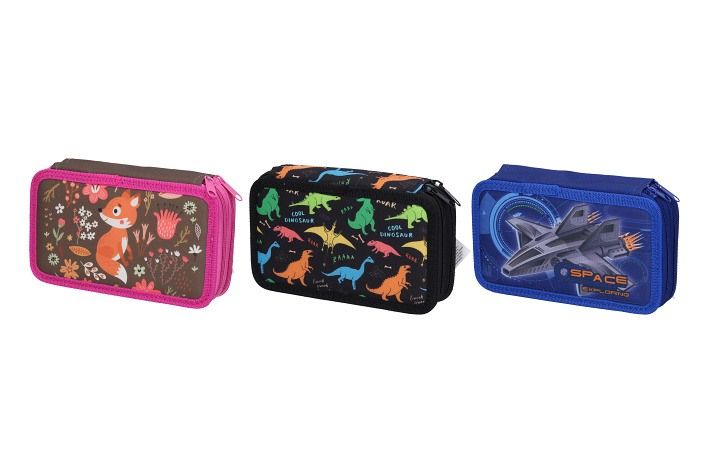 Dvoupatrový penál s výbavou je určen pro žáky základní školy. Každé jednotlivé patro se uzavírá na samostatný zip. Pouzdro má pružné gumové poutka pro uložení psacích potřeb.