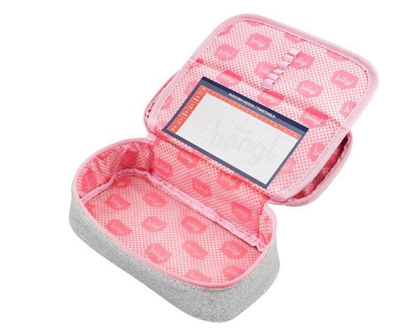 Pevný penál na zip s dvojitou výklopnou chlopní. Vnitřní kapsa na zip. Kapsa se školním rozvrhem.