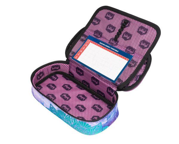 Pevný penál na zip s dvojitou výklopnou chlopní. Vnitřní kapsa na zip. Kapsa se školním rozvrhem.