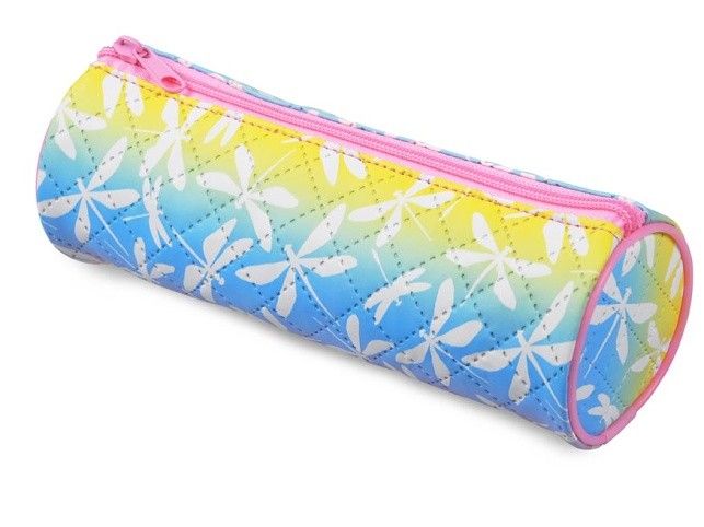 Školní penál/etue válcového tvaru s přechodovým barevným designem, který se mění z modré do žluté barvy. Penál je ozdoben bílými motivy vážek, které dodávají celkovému vzhledu lehkost a hravost. Prošívaný vzor penálu zajišťuje pevnost a zároveň mu přidává na zajímavosti. Penál má růžový zip, který kontrastuje s barevným podkladem a uzavírá ho po celé délce. Tento penál je ideální pro uschování psacích potřeb, od tužek a per až po pastelky, fixy, gumu a ořezávátko. - není vybavený - zdravotně nezávadný a neobsahuje toxické látky DOPORUČENÍ: - čistit pouze navlhčeným hadříkem ve vodě s trochou saponátu Uvedená cena je za 1 ks.