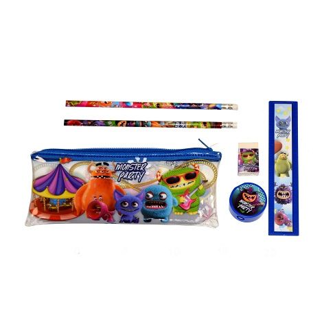 Penál monster set Obsahuje: 2 tužky s gumou, ořezávátko, gumu a pravítko.