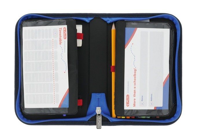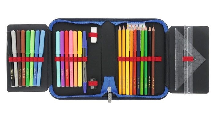 20,3 x 14 x 3,5 cm, 31 dílů - 14 fixů, 8 šestihranných pastelek, 2 tužky, ořezávátko, guma, 16 cm pravítko, trojúhelník, kuličkové pero, rozvrh hodin, vizitka, materiál: polyester