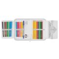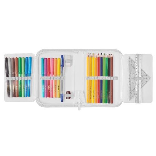20,3 x 14 x 3,5 cm, 31 dílů - 14 fixů, 8 šestihranných pastelek, 2 tužky, ořezávátko, guma, 16 cm pravítko, trojúhelník, kuličkové pero, rozvrh hodin, vizitka, materiál: polyester