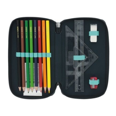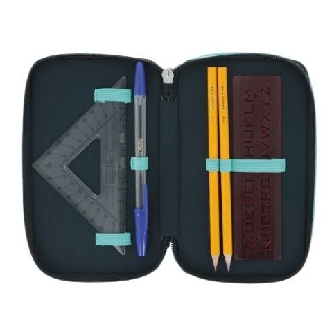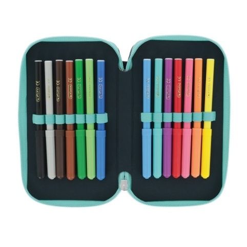 31 ks, materiál polyester, 3 přihrádky na zip (barevné), vnitřní materiál: barevný, výplň: 14 fix,8 šestihranných pastelek, 2 černé šestihranné tužky, 1 plastové ořezávátko,1 barevná šablona