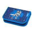 Plný penál Kluci 2019, 1 chlopeň, 20,3 x 13,5 x 3,5 cm, 19 dílů - 6 fixů, 6 pastelek, tužka, ořezávátko, guma, kuličková tužka, 16 cm pravítko, kapsička, rozvrh hodin, materiál: polyester, mix motivů: Góóól, Motokros, Formule, Dino modrý