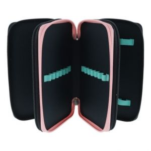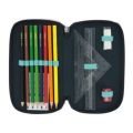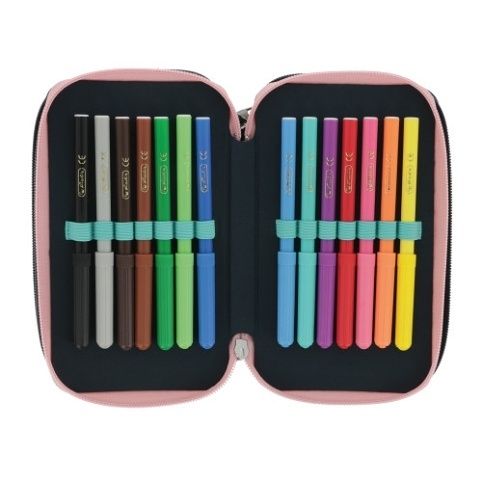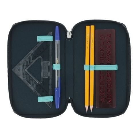 31 ks, materiál polyester, 3 přihrádky na zip (barevné), vnitřní materiál: barevný, výplň: 14 fix,8 šestihranných pastelek, 2 černé šestihranné tužky, 1 plastové ořezávátko, šablona
