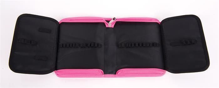 Dvě vnitřní klopy; klasické gumové úchyty na pastelky a fixy; širší úchyty na pravítko, kružítko či nůžky a větší úchyty na gumu a ořezávátko.