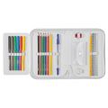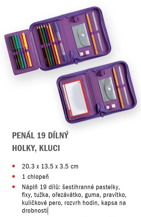 19,3 x 13,5 x 3,5 cm, 19 dílů - 6 fixů, 6 pastelek, tužka, ořezávátko, guma, kuličková tužka, 16 cm pravítko, kapsička, rozvrh hodin, materiál: polyester, mix motivů: Drak zelený, Vesmír, Formule, Dino modrý