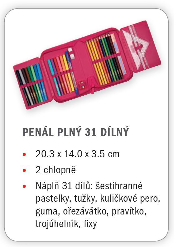 • Náplň 31 dílů: výbava obsahuje 31 dílů - 14 fixů, 8 šestihranných pastelek, 2 tužky HB, ořezávátko, gumu, 16 cm pravítko, malý trojúhelník, kuličkové pero, rozvrh hodin, vizitku.