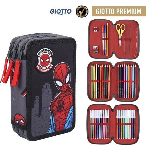 Penál 3 patrový Spiderman Premium. Penál obsahuje 16 pastelek, 16 fixů, pravítko, gumu, nůžky, ořezávátko, 2 obyčejné tužky, 2 zvýrazňovace a 2 propisovačky. Rozměr penálu je 12,5×19,5×6 cm. Rozněr 13×20×5 cm.100%POLYESTER