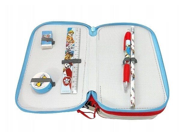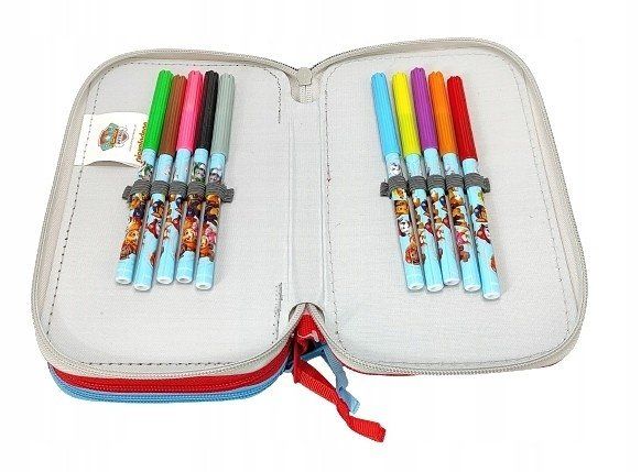 Penál 3 patrový Tlapková Patrola. Penál obsahuje 10 pastelek, 10 fixů, pravítko, gumu, ořezávátko, 1 obyčejnou tužku a 1 propisovačku. Rozměr penálu je 12,5×19,5×6 cm. Materiál 100% polyester.