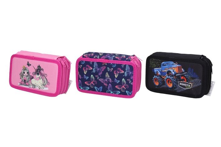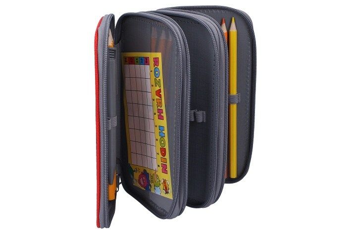 Třípatrový penál s výbavou je určen pro žáky základní školy. Každé jednotlivé patro se uzavírá na samostatný zip. Pouzdro má pružné gumové poutka pro uložení psacích potřeb.