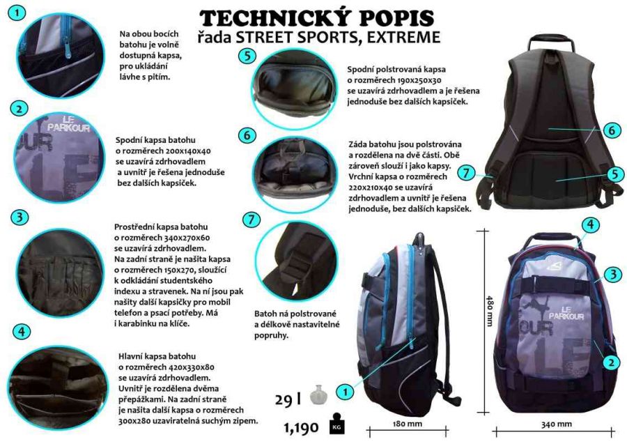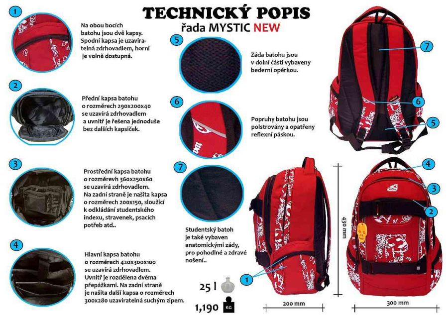 Kvalitní studentský penál. Na horní klopě je našita kapsa uzavíraná zdrhovadlem. Na ní jsou pak našity další dvě malé kapsičky. Prostřední klopa je po rozlepení suchého zipu rozevíratelná. Na její horní i spodní straně je našito deset pruženkových poutek pro uložení psacích potřeb.