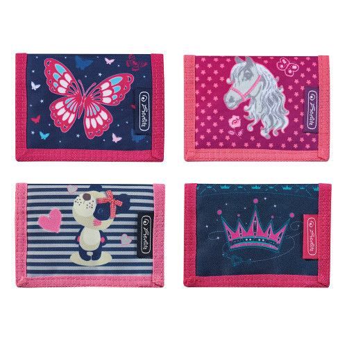 11,5 x 8 x 2 cm, kroužek na klíče, zapínání na suchý zip, kapsička na mince, materiál: polyester, mix motivů: Motýl, Kůň, Panda, Korunka