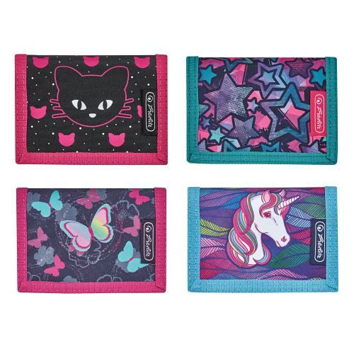11,5 x 8 x 2 cm, kroužek na klíče, zapínání na suchý zip, kapsička na mince, materiál: polyester, mix mtivů: kočička, hvězdy, motýlek, jednorožec