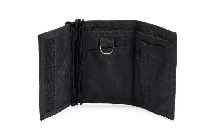 Praktická peněženka na krk má na vnější straně průhlednou kapsičku na průkazy či karty. Uvnitř je praktický organizér s 5 kapsičkami na bankovky a drobnosti, kapsička na zip na mince a kovový kroužek na klíče. Peněženka se zavře suchým zipem a zavěsí na krk látkovou šňůrkou.