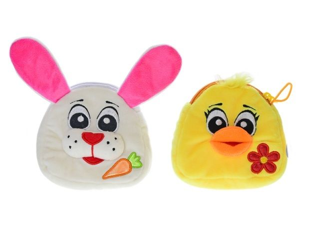 Plyšová peněženka na zip ve tvaru zajíčka a kuřátka o velikosti 12x10cm. Do takové peněženky si budou děti rády spořit. Díky malému poutku u zipu je možné peněženku přidělat na klíče nebo k popruhu. Vhodné pro děti od narození.