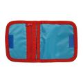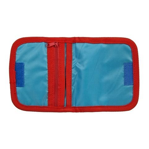 Praktická textilní peněženka na suchý zip, s provázkem kolem krku. Uvnitř uzavíratelná kapsička na zip na drobné a přihrádka na bankovky.